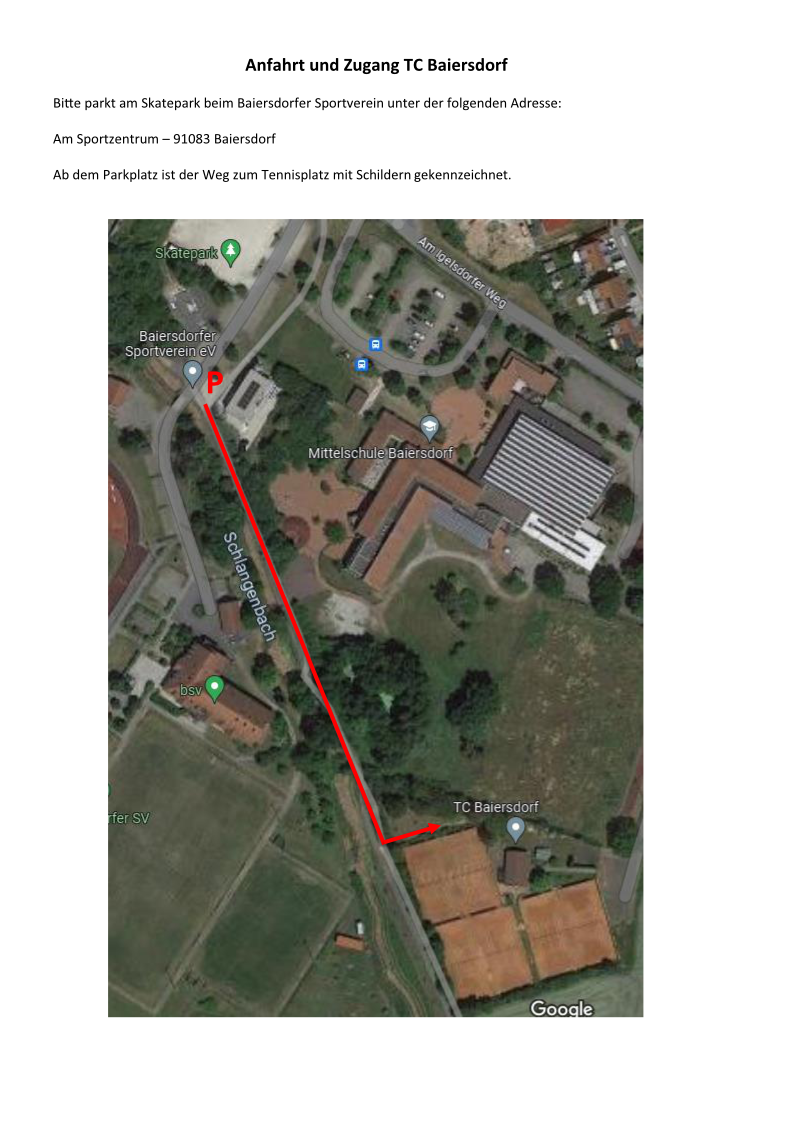 auf Grund einer Baustelle ist die Zufahrt zum Haupteingang des TC Baiersdorf bis Juni leider nicht möglich. Bitte nutzt den Hintereingang (Rückseite Platz 1/2) vom Schlangenbach gem. der beigefügten Karte.